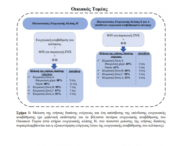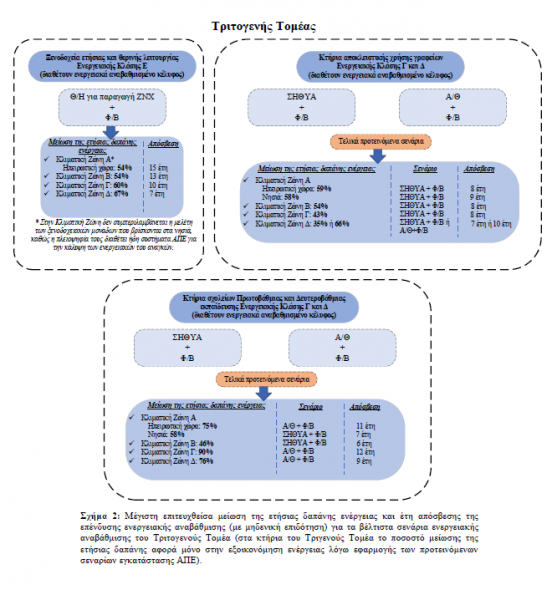 Συγκεκριμένα, σύμφωνα με τα δεδομένα του Σχήματος 1, όσον αφορά τα κτήρια του Οικιακού Τομέα και λαμβάνοντας υπόψη το σενάριο συγκρατημένης χρέωσης η μέγιστη μείωση της ετήσιας κατανάλωσης ενέργειας που μπορεί να επιτευχθεί ανά κτήριο κυμαίνεται μεταξύ 81% – 90%, με την απόσβεση της επένδυσης ενεργειακής αναβάθμισης των πλέον ενεργειακά φτωχών κτηρίων (κλάσης Η) να επέρχεται σε διάστημα μεταξύ 5 και 12 ετών, χωρίς μάλιστα την αξιοποίηση κάποιας αρχικής επιδότησης (σημειώνεται ότι στα κτήρια ενεργειακής κλάσης Η, στο κόστος της επένδυσης συμπεριλαμβάνεται και η ενεργειακή αναβάθμιση του κελύφους). Αντίστοιχα, στην περίπτωση της αναβάθμισης των κτηρίων ενεργειακών κλάσεων Ε και Δ (τα οποία διαθέτουν ήδη αναβαθμισμένο κέλυφος) σε ιδιαίτερα αποδοτικές κλάσεις, έως και τη Β+, εκτιμάται ότι η μέγιστη μείωση της ετήσιας κατανάλωσης ενέργειας ανά κτήριο κυμαίνεται μεταξύ 30% – 60%, επιτυγχάνοντας απόσβεση σε χρονικό διάστημα που δεν ξεπερνά τα 5 έτη. Όσον αφορά τα κτήρια του Τριτογενούς Τομέα και συγκεκριμένα τα ξενοδοχεία, από τα δεδομένα του Σχήματος 2 συμπεραίνεται ότι η εγκατάσταση Θ/Η συστημάτων σε συνδυασμό με Φ/Β μονάδες, επιφέρει και σε αυτήν την περίπτωση αξιοσημείωτη εξοικονόμηση ενέργειας, η οποία ανέρχεται έως και 68%. Από την άλλη πλευρά, στα κτήρια γραφείων και στα σχολεία Πρωτοβάθμιας και Δευτεροβάθμιας εκπαίδευσης, η εγκατάσταση Θ/Η συστημάτων δεν αποδεικνύεται το ίδιο αποδοτική. Σε αυτήν την περίπτωση, η εγκατάσταση συστημάτων ΣΗΘΥΑ ή Α/Θ συνδυαστικά με μικρά Φ/Β συστήματα πλεονεκτεί, λόγω της φύσης των φορτίων και του ωραρίου / περιόδου λειτουργίας αυτής της κατηγορίας κτηρίων, οδηγώντας (σύμφωνα με τα δεδομένα του Σχήματος 2) σε εντυπωσιακή μείωση της ετήσιας ενεργειακής δαπάνης (μεταξύ 35% – 66% για τα κτήρια γραφείων και 46% – 90% για τα σχολικά κτήρια). Αυτό το ύψος εξοικονόμησης, σε συνδυασμό με τη χαμηλή διάρκεια απόσβεσης, αποτελούν σημαντικό κίνητρο για τη διαμόρφωση ενός βιώσιμου πλαισίου ενεργειακής αναβάθμισης των κτηρίων Δημόσιας Χρήσης.